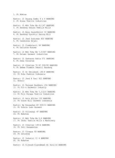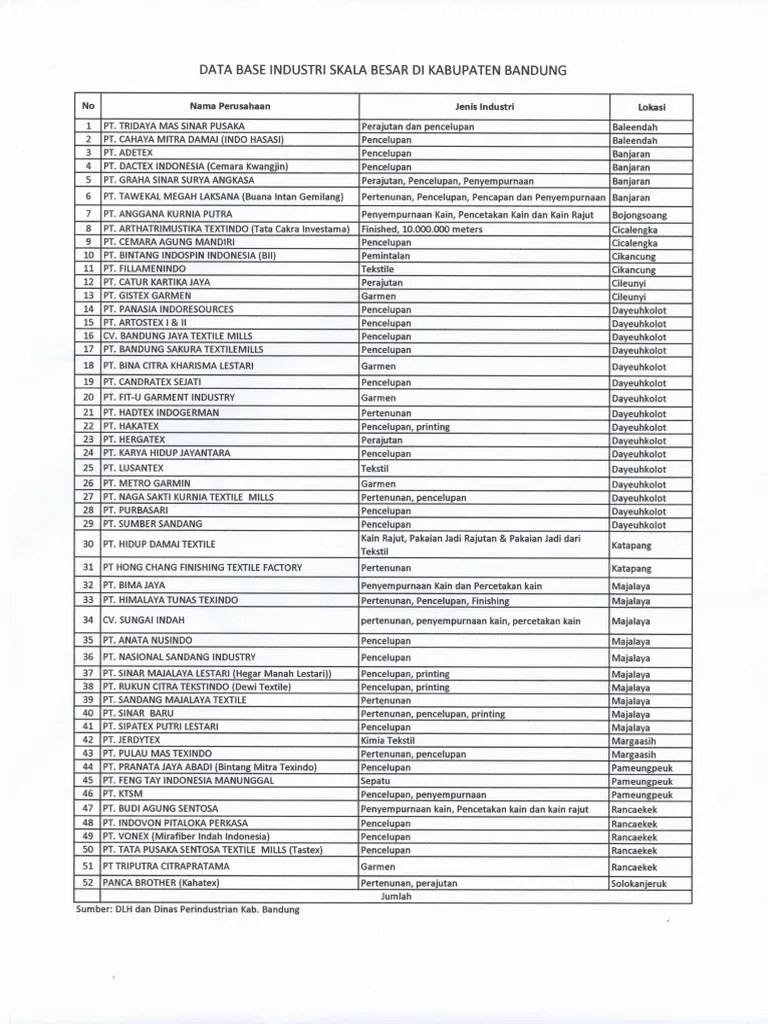 Centex was established in 1970 and is an integrated textile mill for t/c, cvc, dobby and oxford fabrics. Honey lady group pt honey lady utama, produsen bra dan pakaian dalam wanita. Writing accurate job description amaris hotel/ neo hotel/ santika hotel, jakarta | 17 januari 2019 | rp. Jl siliwangi 47 bandung 16. Teijin indonesia fiber corp., pt. 5,6, bandung, jawa barat telp. Info gaji karyawan pt bandung indah gemilang di situs jobplanet terbaru tahun 2017 yang bersumber dari karyawan/mantan karyawannya. Jababeka iv blok c 3 kawasan industri jababeka i, bekasi, jawa barat So these are the major manufacturers we will be looking for. 022‐5207315 kosmetika 12 mustika ratu jl. Ihchitex, pt pt ihchi textile mills, pabrik kain denim dan indigo. Transmigrasi propinsi jawa barat sebanyak5 kali. Rt 009 / rw 005 kecamatan regol , bandung , jawa barat 0.7 km;